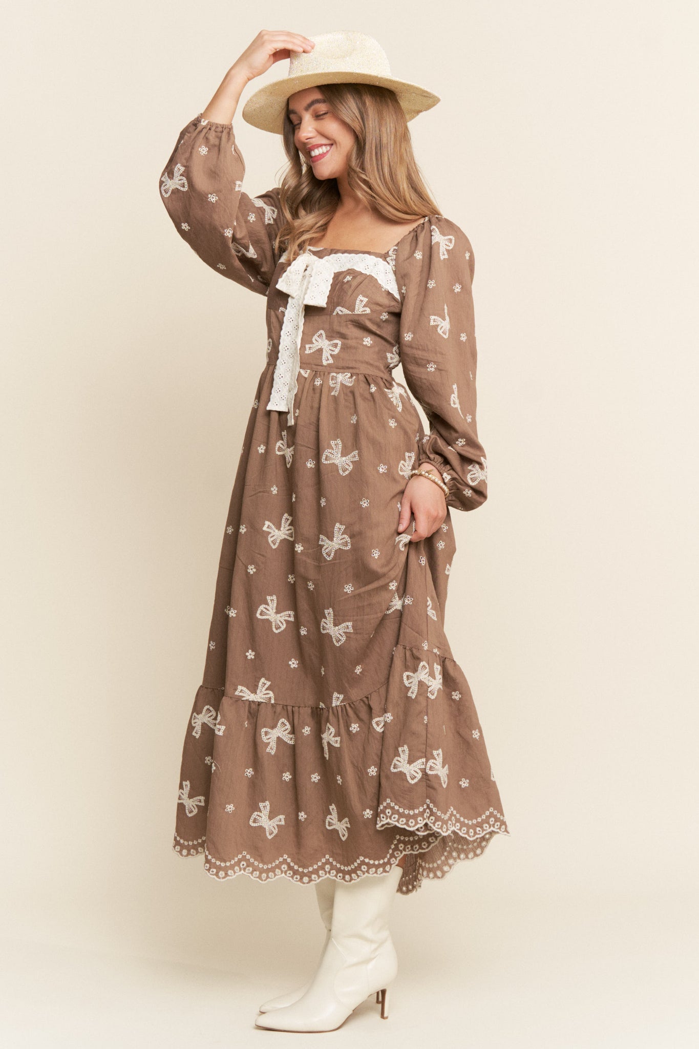 This elegant dress is true to size and available in Small, Medium, and Large. It features beautifully embroidered bows that add a delicate, feminine touch. Designed with long sleeves and a tiered silhouette, it offers both modesty and timeless charm—perfect for any occasion.