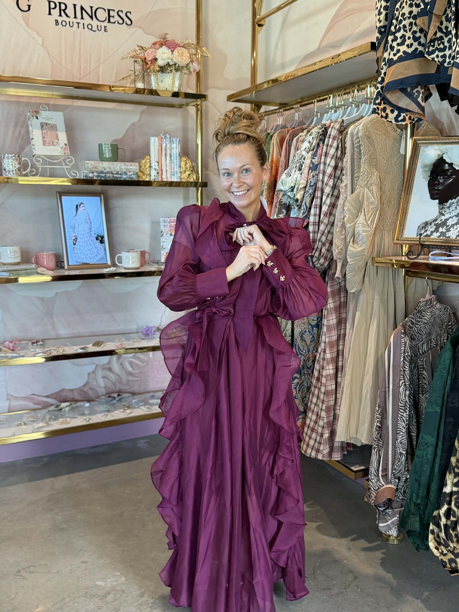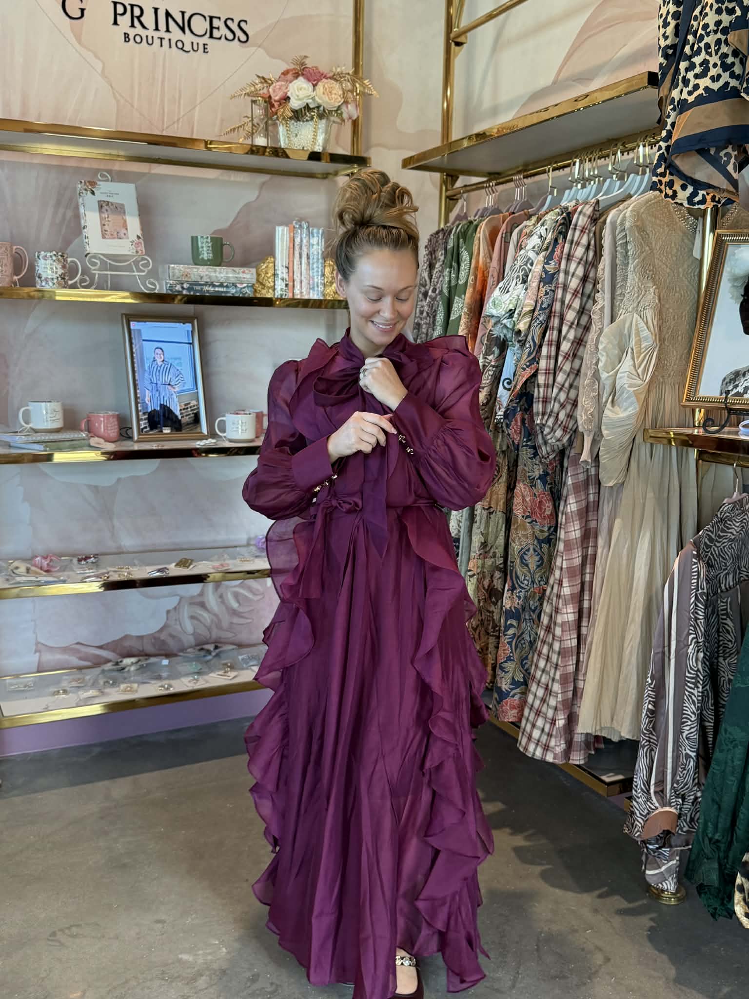 This elegant deep wine midi dress is true to size and crafted for a timeless, feminine silhouette. Featuring cascading ruffles from bodice to hem, a high-neck tie detail, and long sleeves with gold button accents, it’s both graceful and modest. Perfect for special occasions, this flowy design combines sophistication and comfort in every size from Small to 2XL.