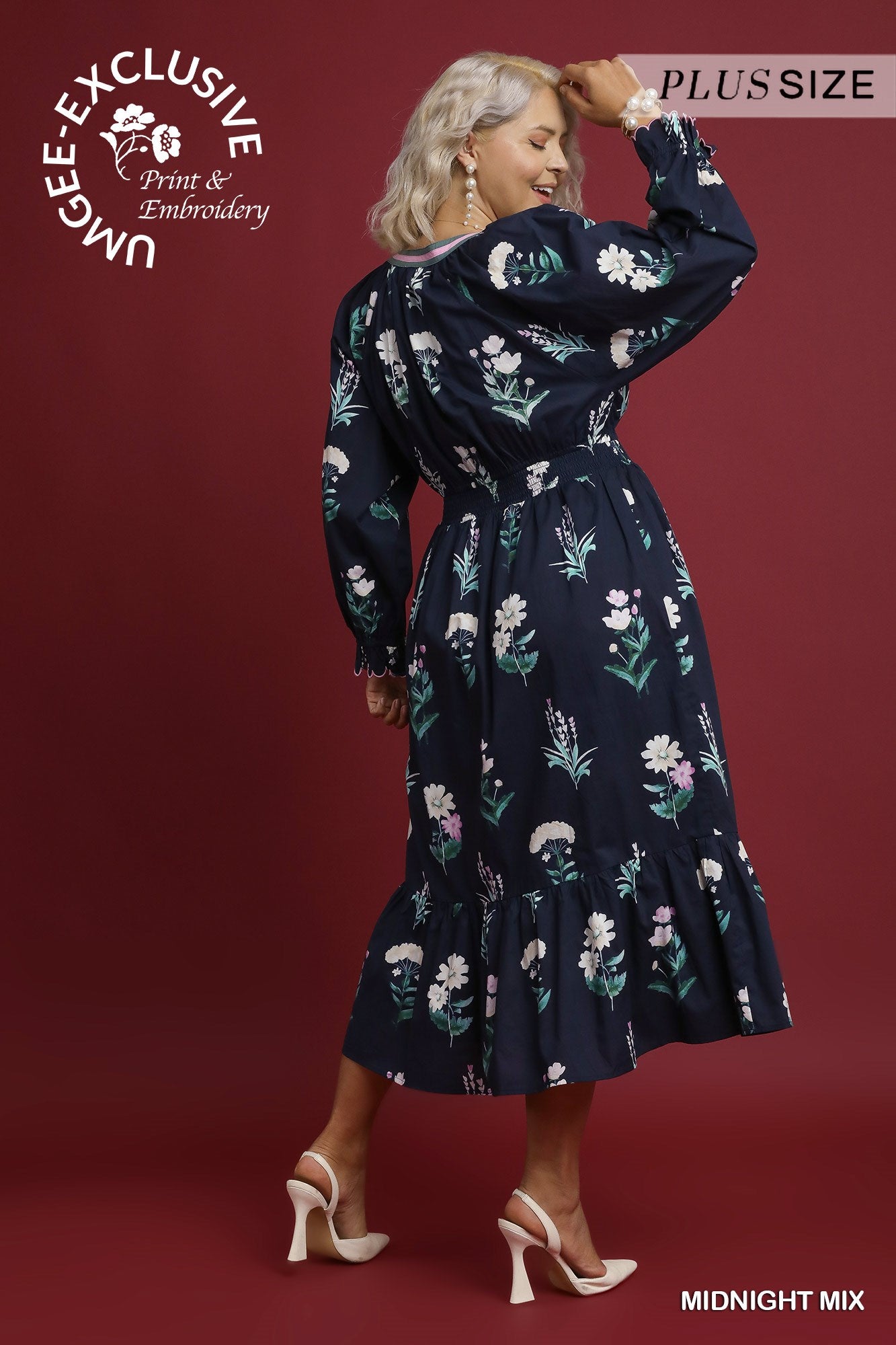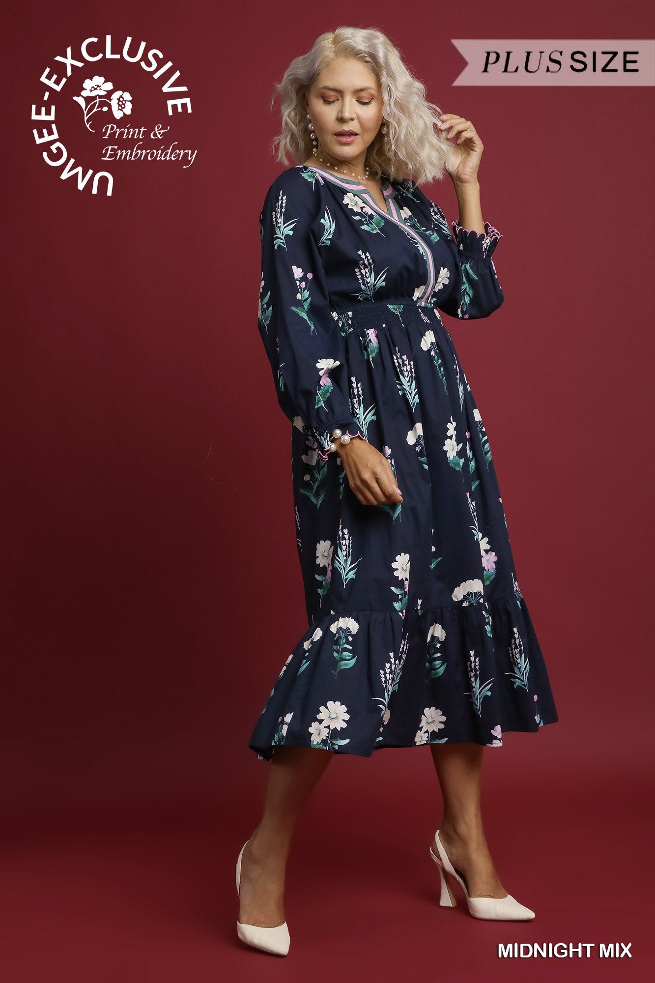 Floral Print V Neck Midi Dress with Ruffled DetailsKey Features• V-neckline• Floral Print• Ruffled Details• Skirt Portion is LinedFit & Model Notes• Model is 5'10" and is wearing an XL.• All Measurements are approximate.Fabric Contents• 100%Cotton