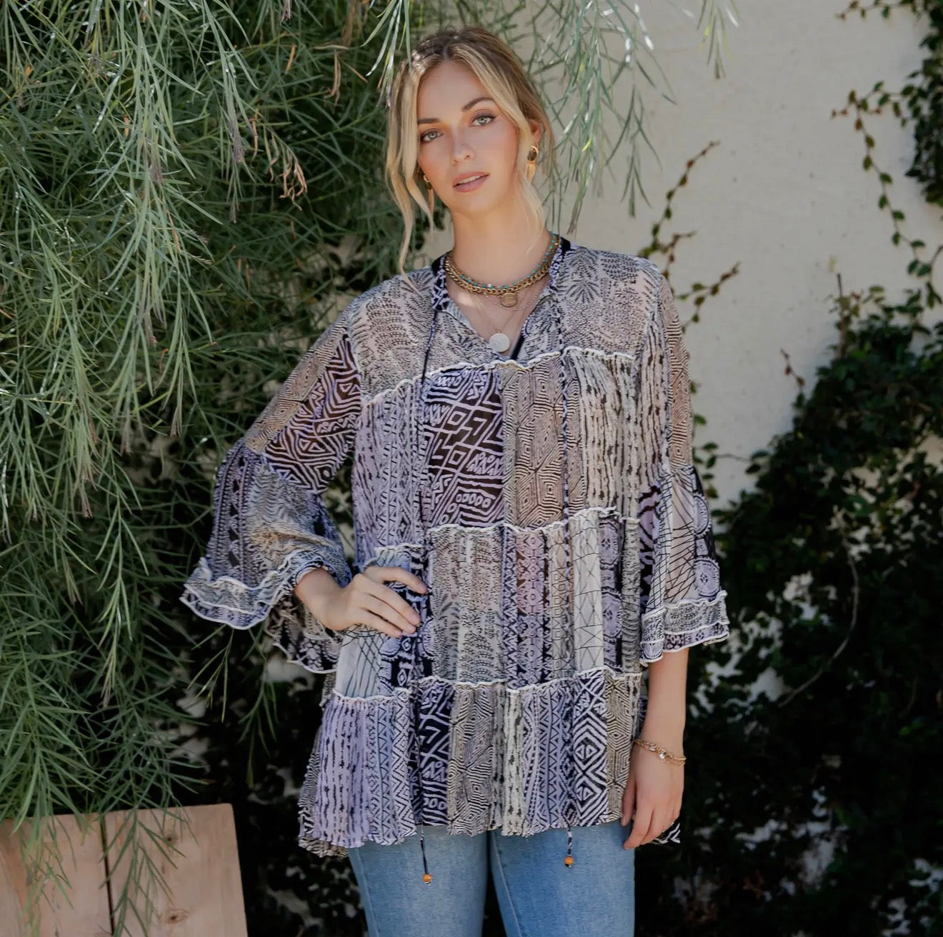 Sleeves: 3/4th sleeves; classic version in simple cut, tiered version with printed frill detailing