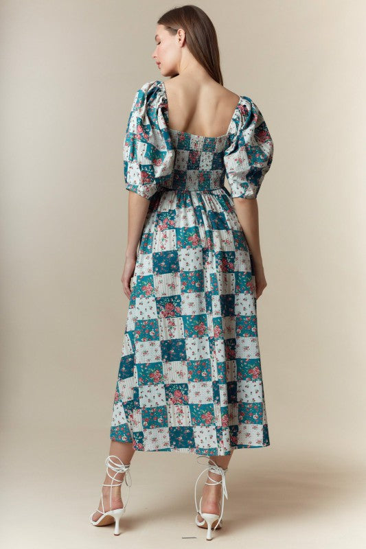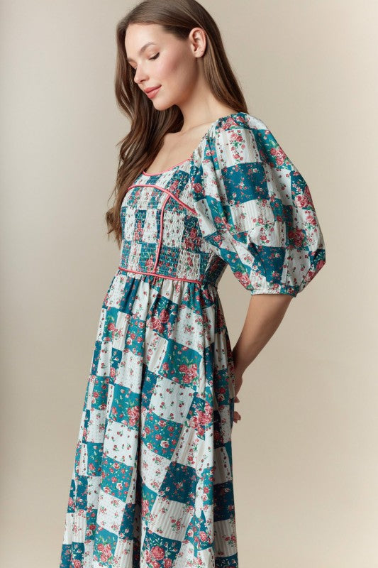 Floral Printed Cotton Poplin Piping Detail Short Sleeve Maxi Dress