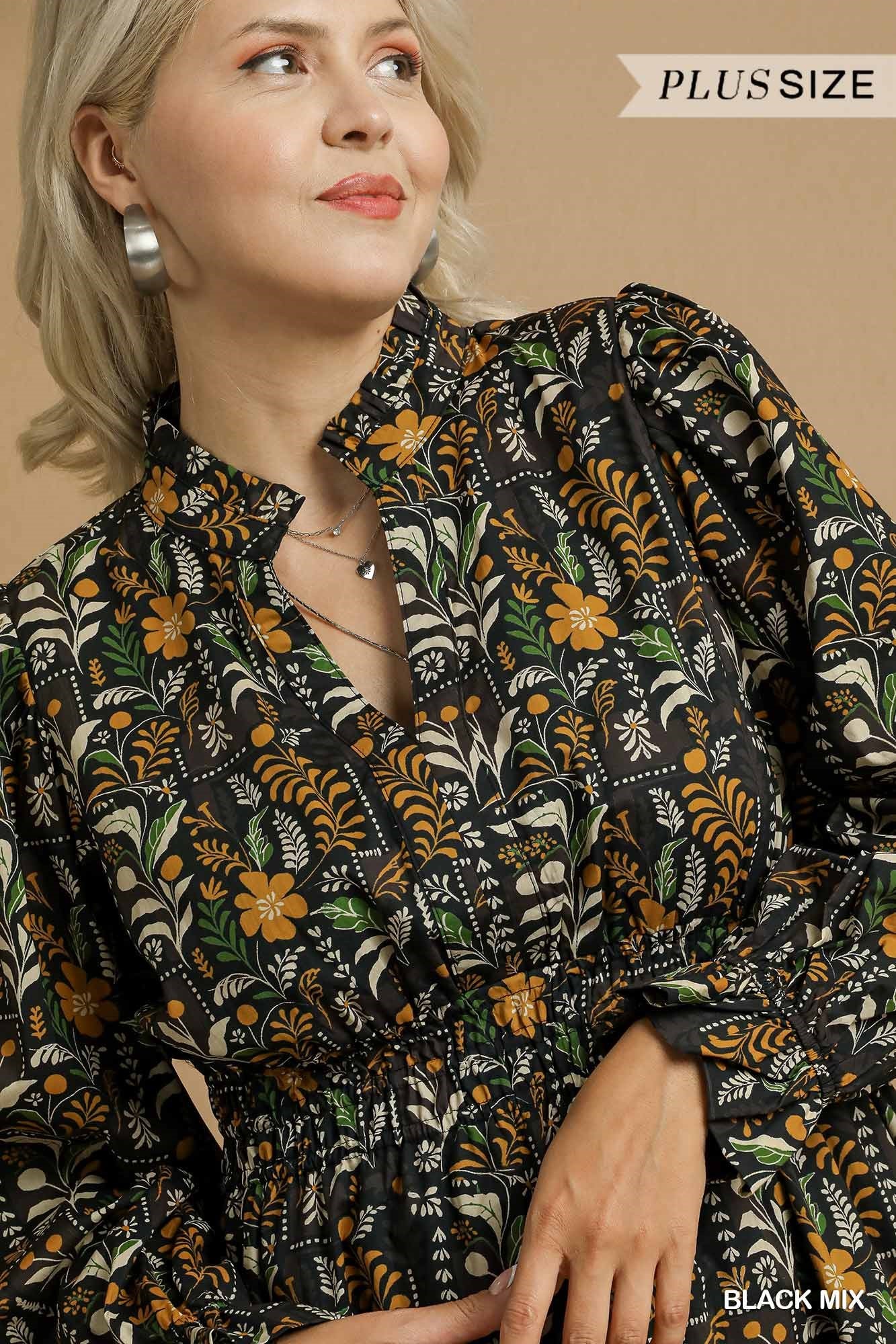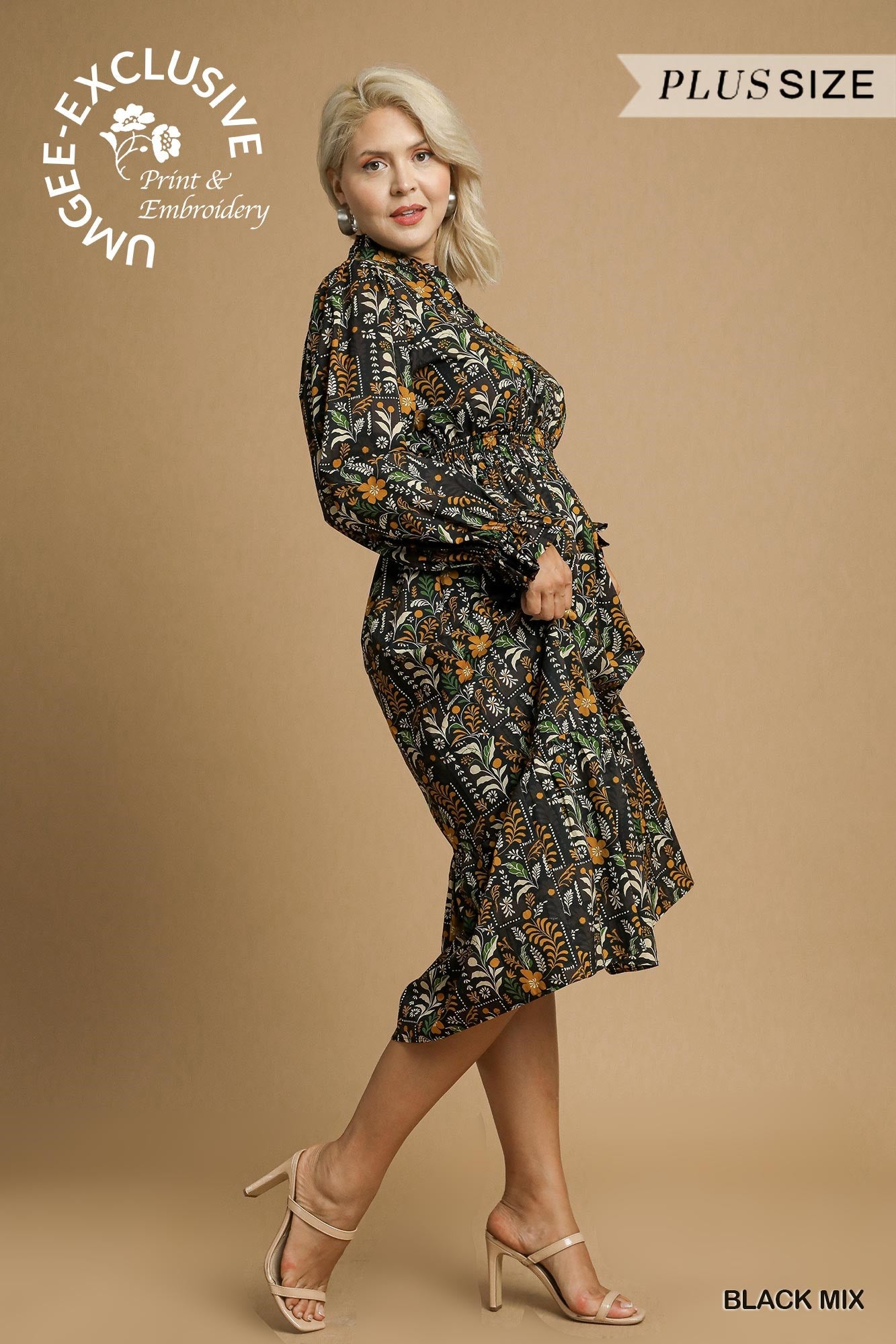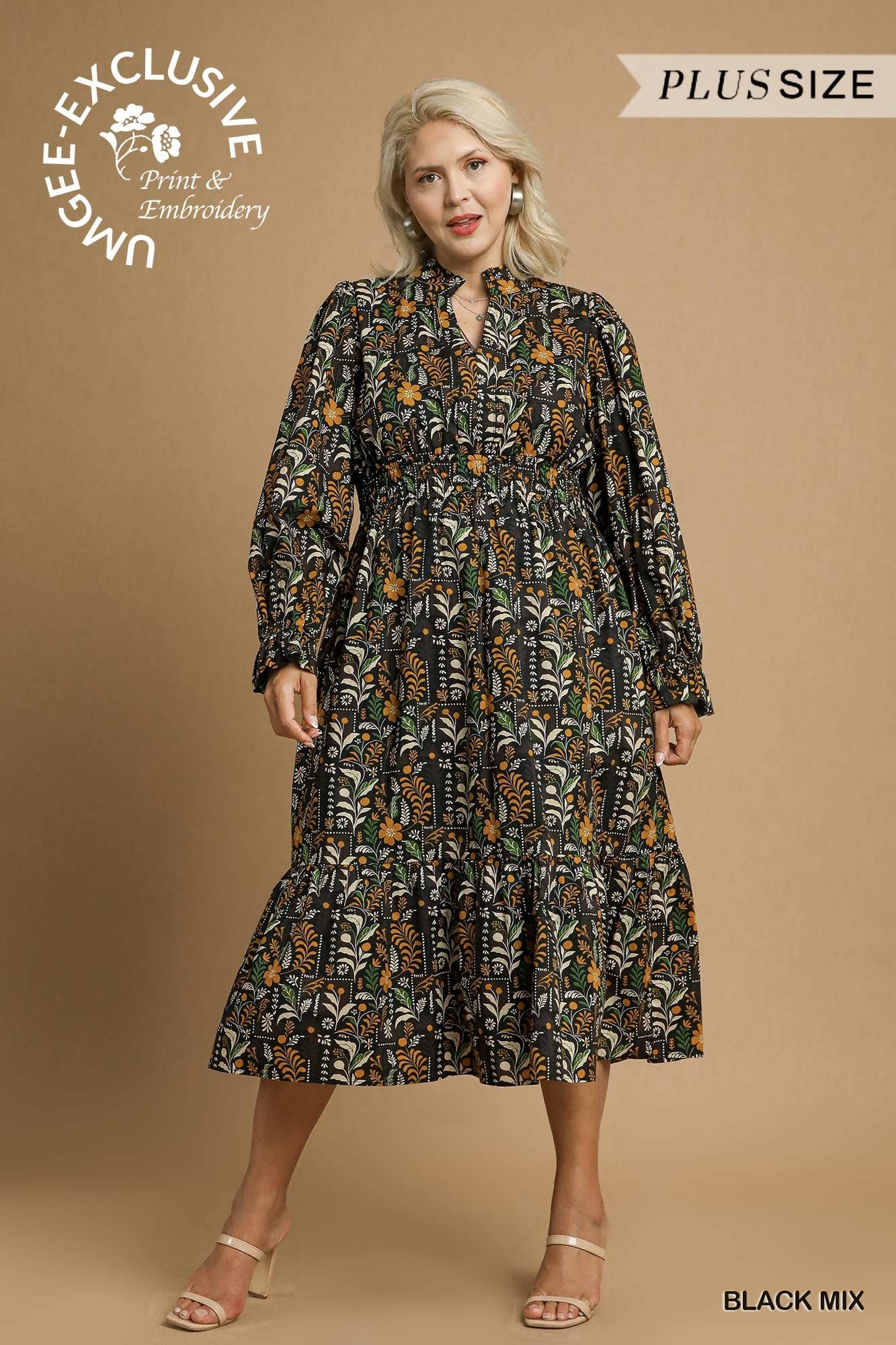 Floral Midi Dress with Smocked WaistKey Features• V-neckline• Ruffle collar trim• Long sleeves with ruffle elastic cuffs• Smocked waist • Lined Fit & Model Notes• Model is 5'10" and is wearing an XL.• All Measurements are approximate.Fabric Contents• 100% Cotton