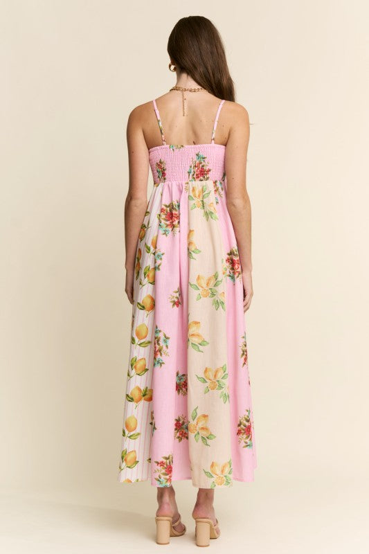 FRUIT AND FLORAL PRINT MAXI DRESS. FUNCTIONAL POCKETS.