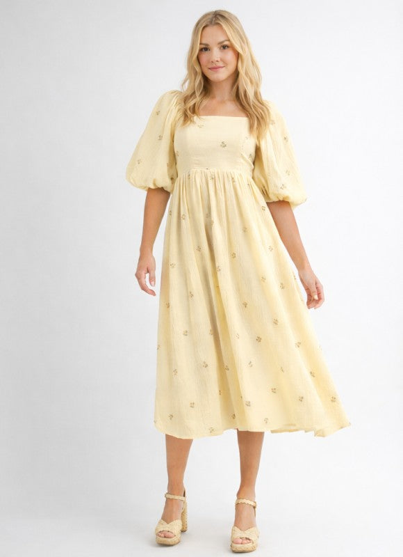 This dress showcases exquisite all-over embroidery on soft textured cotton fabric. The back smocking and elastic waist ensure comfort, resulting in a relaxed yet stylish look that's perfect for any occasion